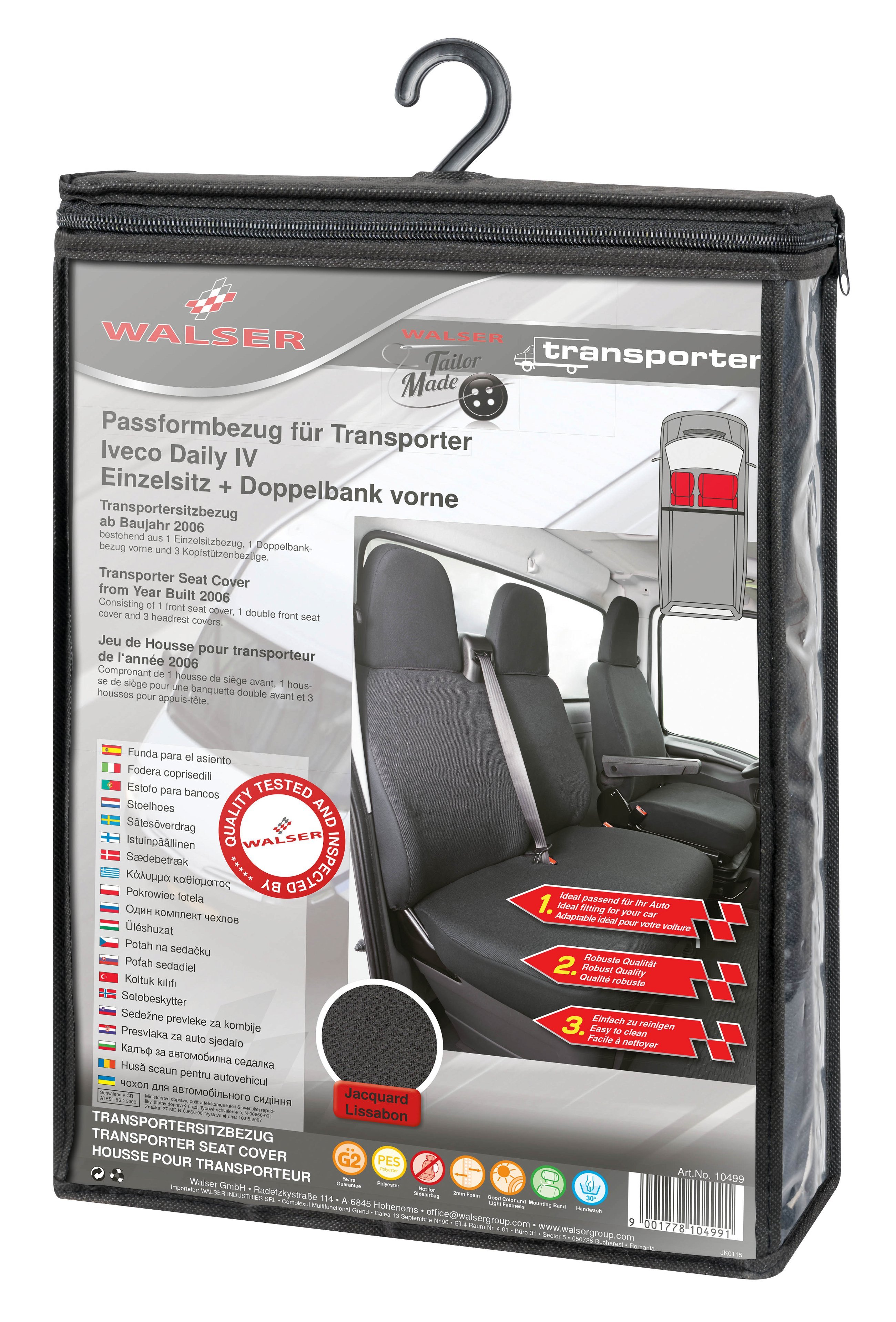 Autostoelhoes Transporter Fit van stof antraciet geschikt voor Iveco Daily IV, 1 enkele zitplaats voorin (uitsparing armleuning) & dubbele zitbank voorin