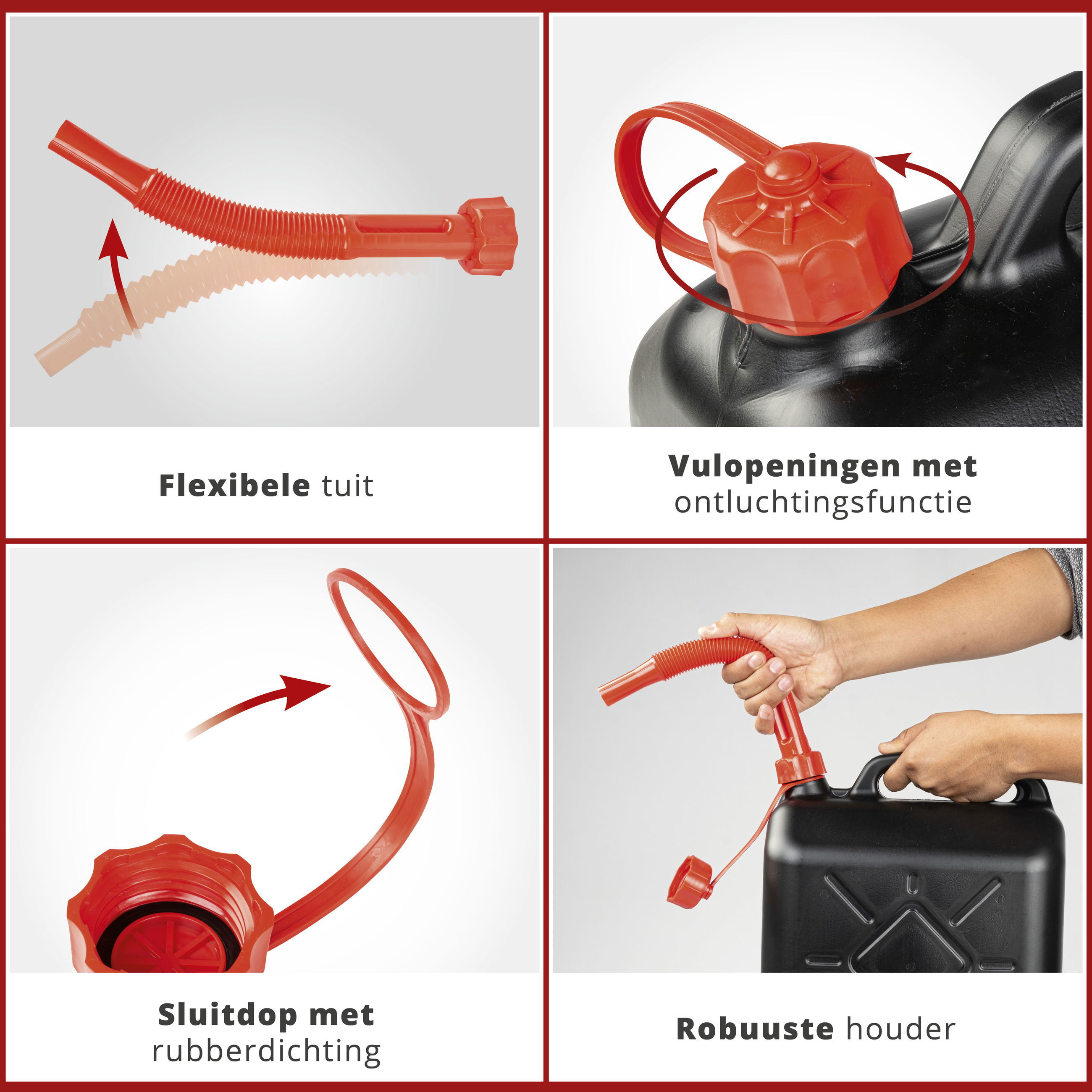 Benzineblik 10 liter, brandstofblik UN-gekeurd, reserveblik met veiligheidssluiting zwart/rood