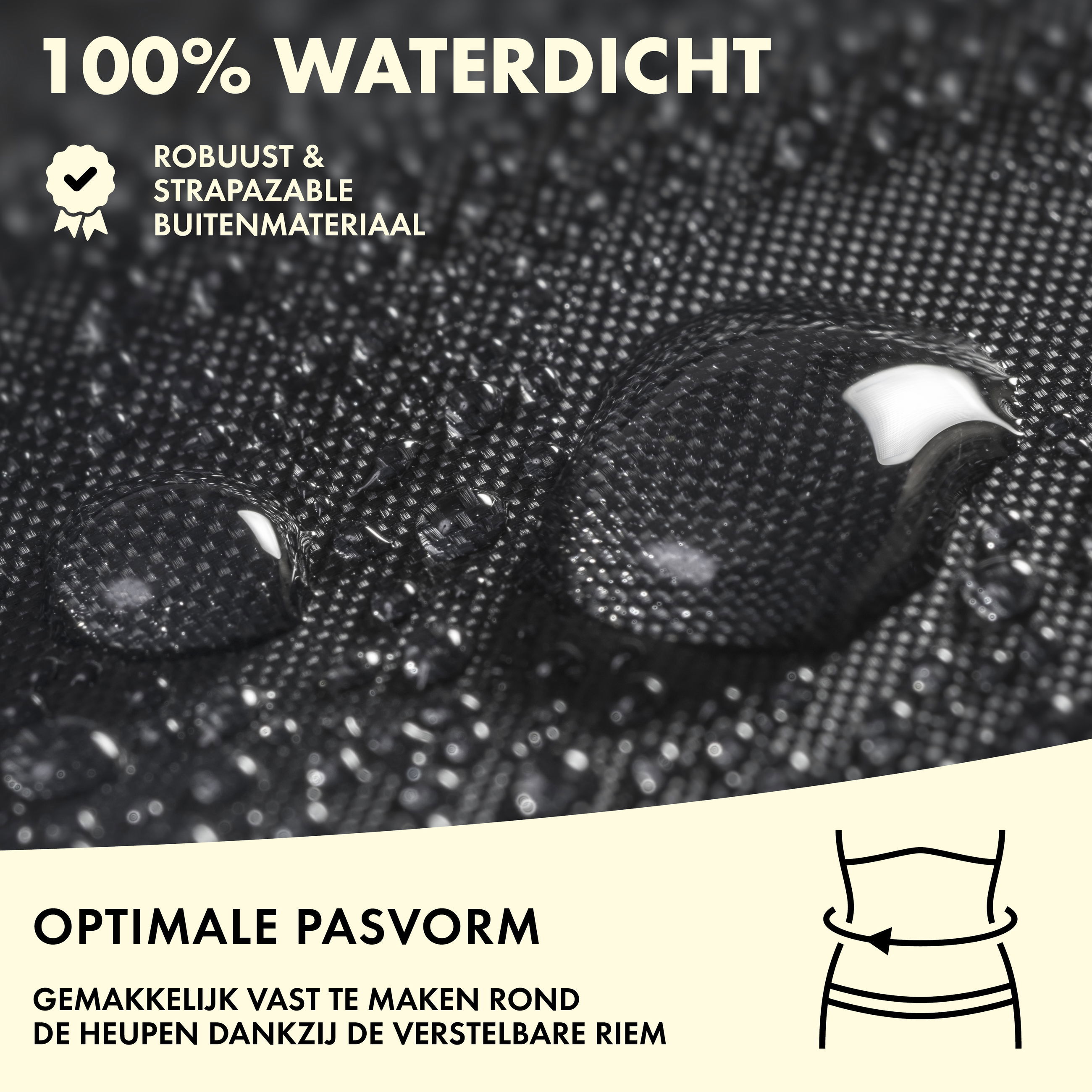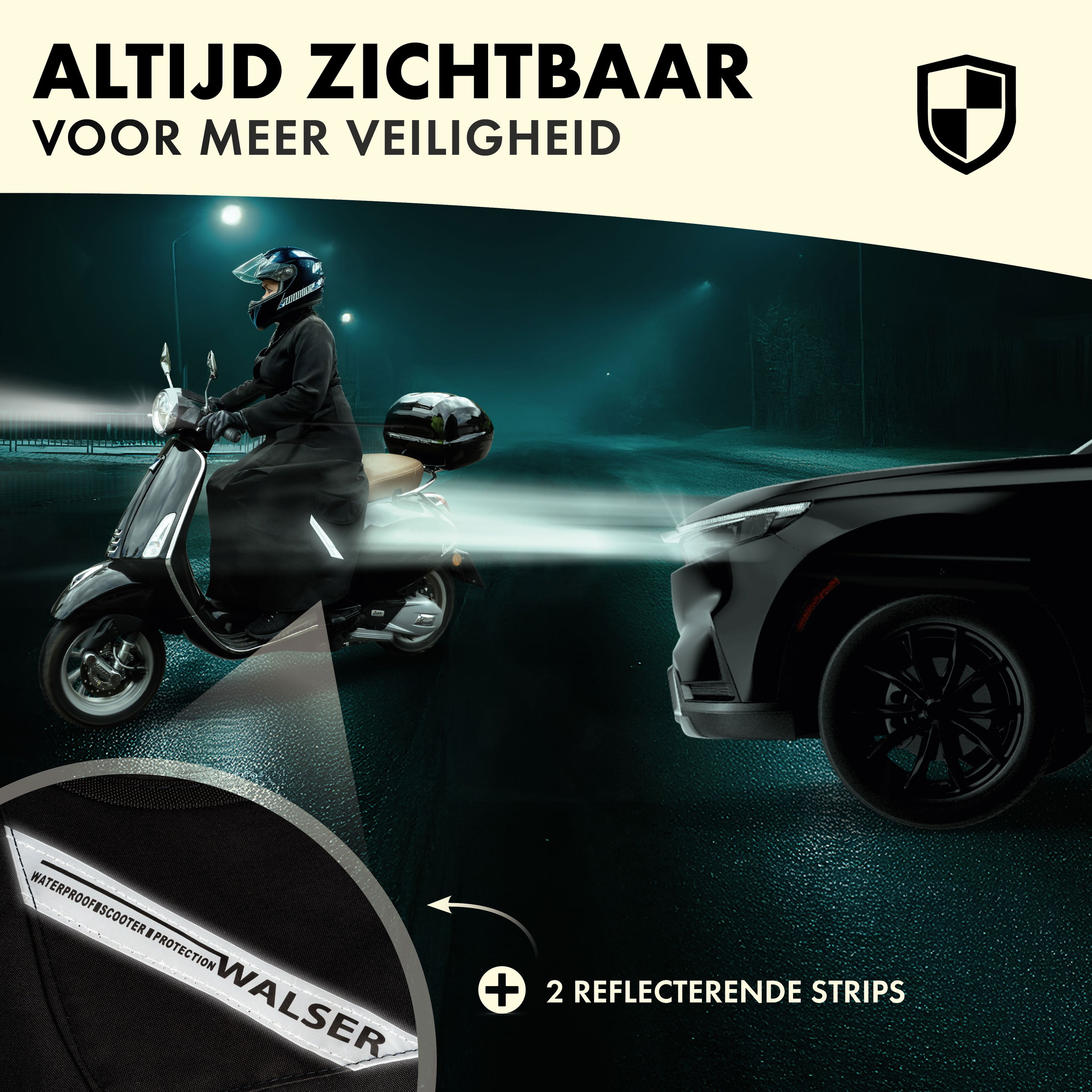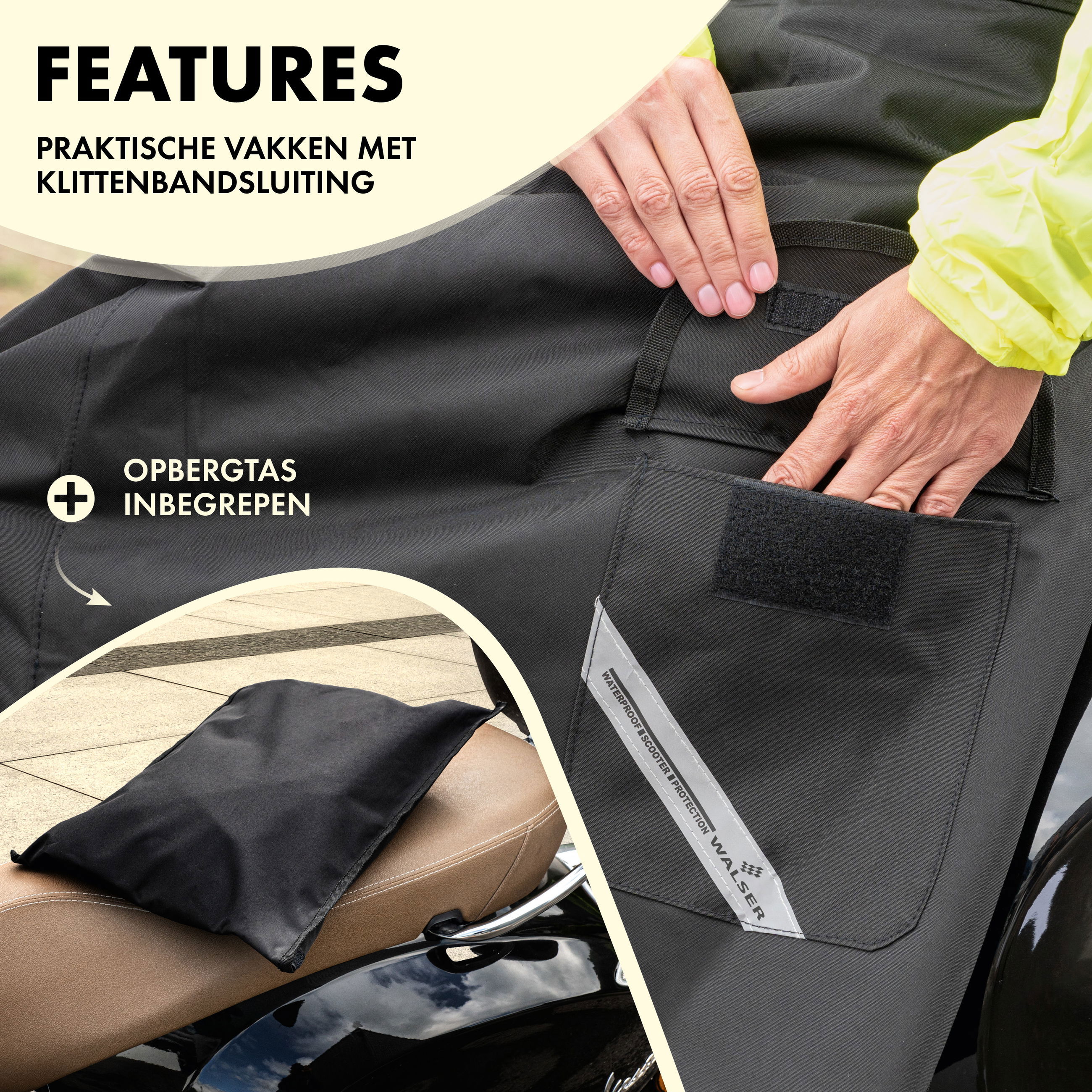 De bescherming tegen natheid voor scooter- en brommerrijders is 100% waterdicht en is geproduceerd van hoogwaardig, stevig polyester. Door een in lengte verstelbare band met knipsluiting kan de bescherming eenvoudig om de heupen worden bevestigd en dan bent u al klaar voor vertrek. De maximale buikomvang bedraagt ca. 150 cm. Aan beide zijden zijn twee tasjes met reflectoren aangebracht die extra opbergruimte bieden. Eén ritssluiting vóór in het midden zorgt voor meer beenruimte, indien dat nodig is.